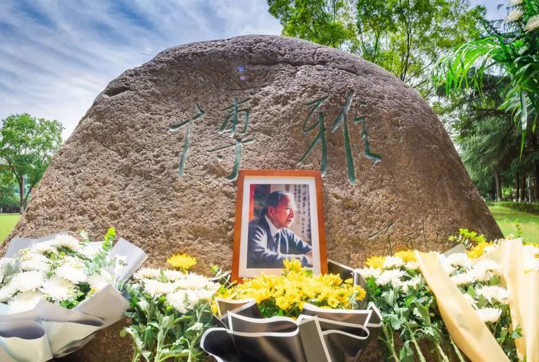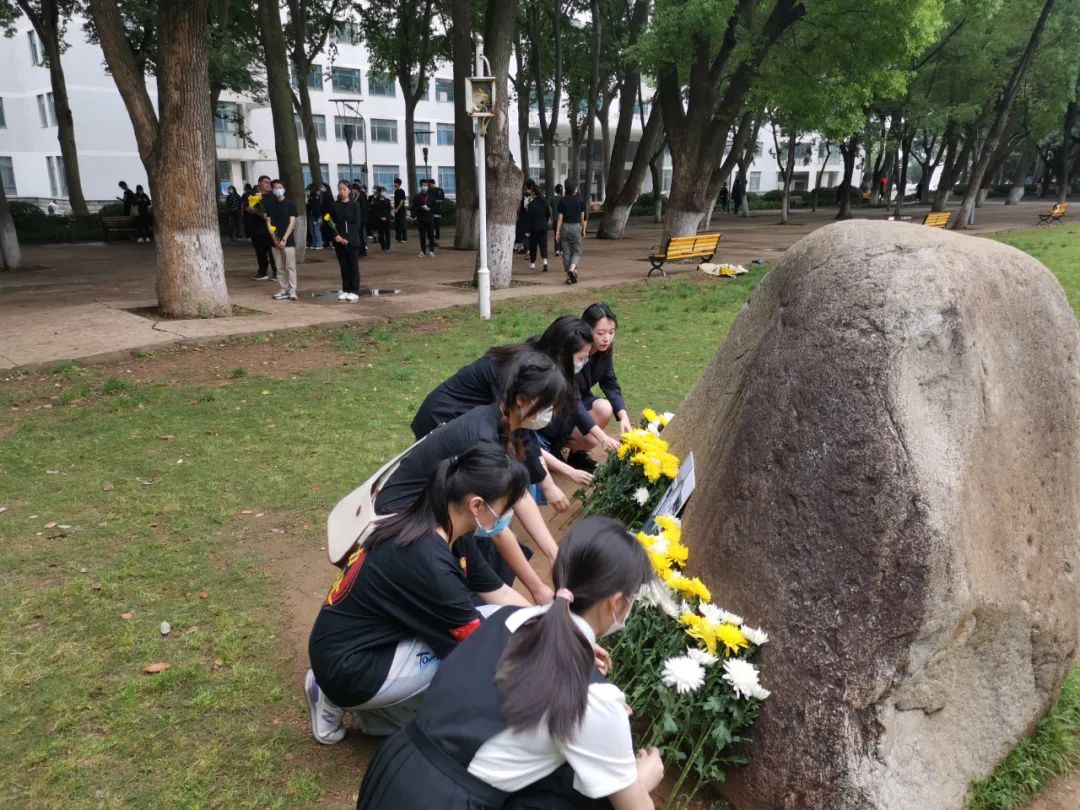 (5月28日,华师学子来到博雅广场章先生题字的博雅石前,献花缅怀老校长)