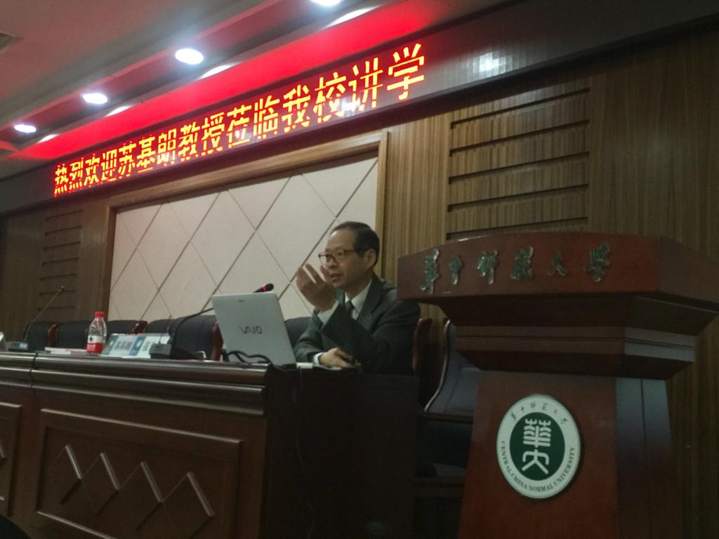 苏教授介绍了新时代的国情与世情,苏教授举例,以诉讼、调解、仲裁解决一带一路国际事务争端,国情方面,以由甘结到人民调解协议为例说明排难解忧纷争,并指出同种文化排难解忧纷争很难,异文化排难解忧将会存在更大的困难,并再次从21世纪回顾了中华文明:从21世纪中文文明新“体用”观至以前的“中学为体,西学为用”三纲五常观推至20世纪“天演论”,并结合社会主义核心价值观谈及自己的观点和看法:“中国八十年实践的经验已经清楚证明,外来文化不管听起来多动人和理想,若不能在传统文化内找到转化、整合和承传的起接点,终究无法为日渐融入国际社会的现代中国带来全面现代化的出路,为饱历忧患的中国人创造精神和物质上的新前景。”
